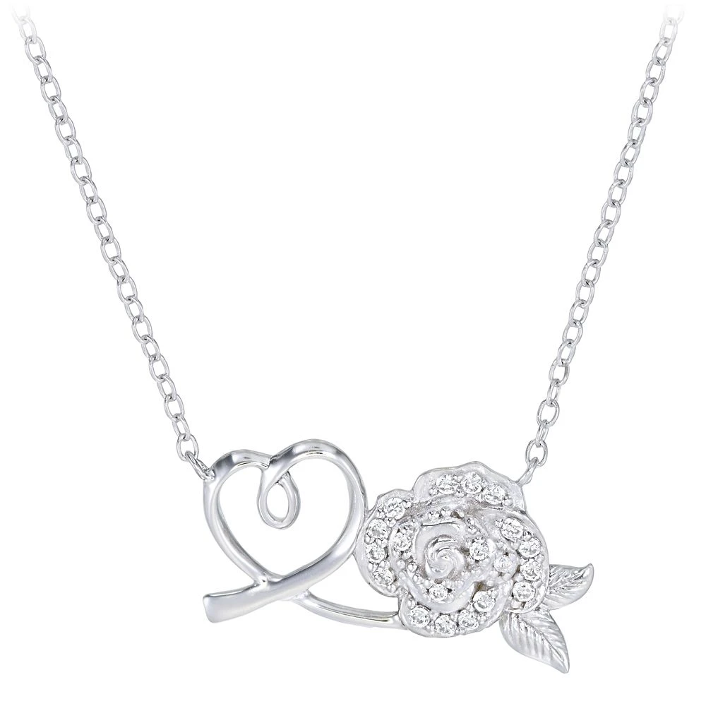 Dazzling cubic zirconia add sparkle to the enchanting rose on this elegant necklace inspired by Beauty and the Beast. Crafted in sterling silver, a heart sits next to the rose on the adjustable cable chain that features a spring ring clasp.