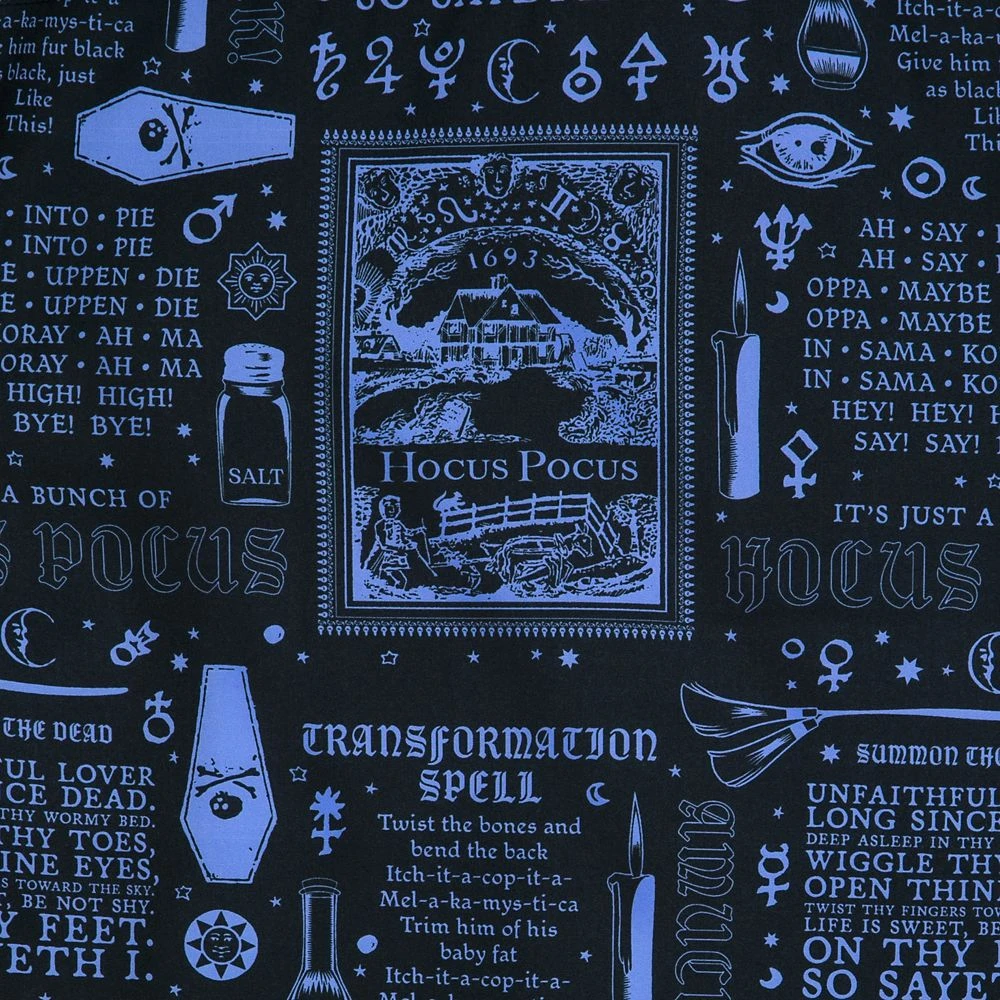 Cast your fiercest spell in this Hocus Pocus ”BOOOOOK” woven shirt by RSVLTS featuring quotations from Winifred’s beloved spellbook and famous icons from the classic Disney film. Softer and more comfortable than any witch would allow, this button down shirt is made from stretchy KUNUFLEX. ”BOOOOOK” defines cool comfort and when it comes to fabulously spooky style, Wini called it.