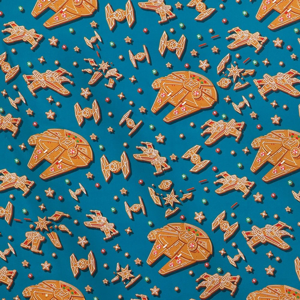 - Allover pattern features holiday cookie versions of the Millennium Falcon, X-Wing, TIE Fighters, stars, sprinkles and blasts