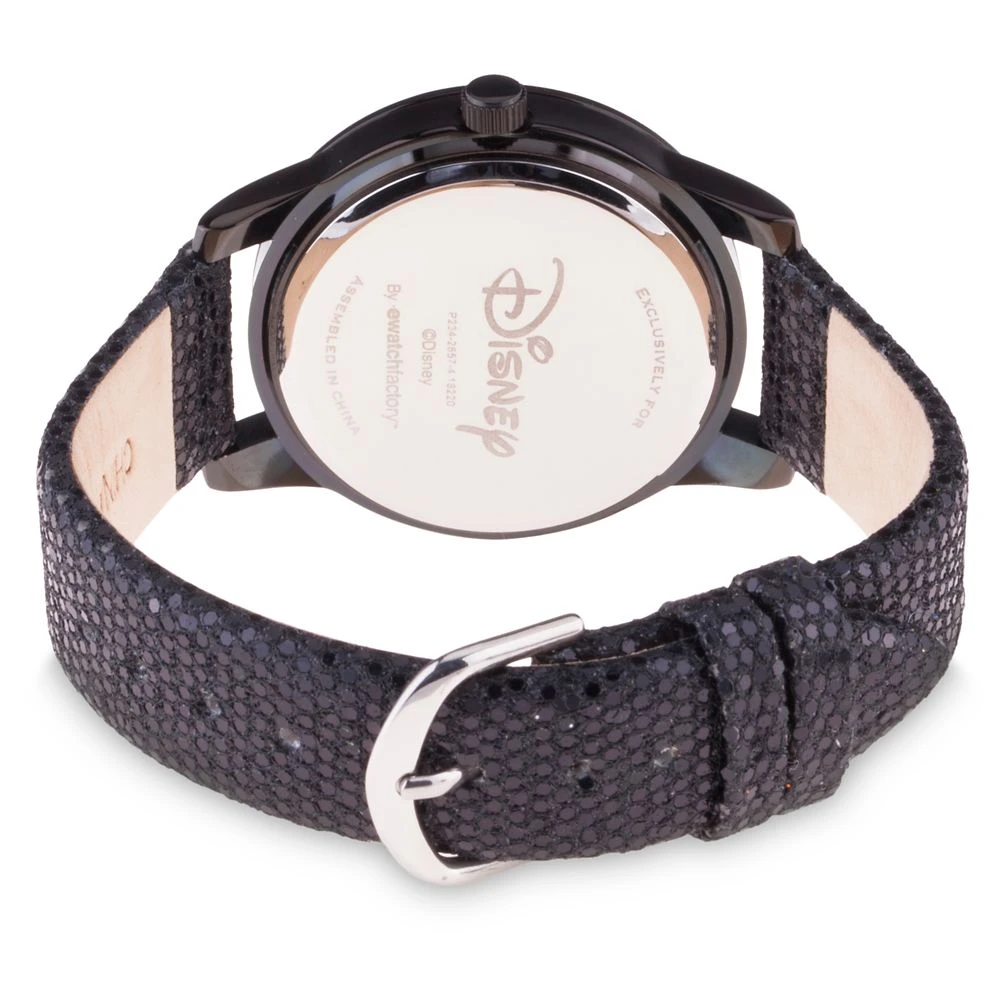 ”What a Wonderful Christmas” it promises to be when you spend it in the company of Jack Skellington. The dial shows the Pumpkin King atop Spiral Hill, while the leather band is coated in shimmering black sequins.
